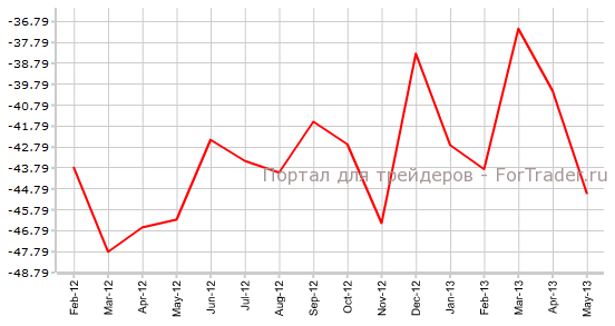 В мае дефицит торгового баланса США увеличился с отметки -40,1В до уровня -45,0В. Согласно прогноза аналитиков финансовых рынков, в июне дефицит торгового баланса сократится до уровня -43,1В.