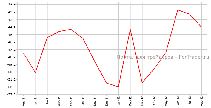По оценке аналитиков журнала ForTrader, снижение торгового баланса США действительно продолжится и покажет фактические цифры примерно в диапазоне прогноза. Этому способствует снижение роста китайской экономики и стагнация в еврозоне. Падение мирового спроса негативно сказываются на американских товарах, а они, в принципе, являются локомотивом промышленного сектора США. Показателем отрицательного сальдо торгового баланса также служит увеличение цен на энергоносители, которое будет стимулировать рост импорта. Выход этих плохих данных может склонить инвесторов к распродаже рискованных активов.