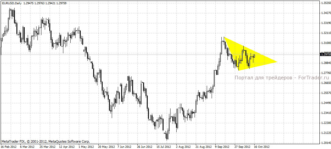Евро пока остается подвержена двум факторам: фактам и словам, что находит подтверждение в треугольнике, формирующемся на дневном графике. В то время, как данные макроэкономической статистики указывают участникам рынка на суровые реалии, поддержку европейской валюте оказывают всевозможные заявления и заверения, звучащие в ободряющих тонах. Так в понедельник поддержку евро оказали разговоры об обращении Испании за финансовой помощью уже в следующем месяце. Поддержал курс евро и германский министр финансов Вольфганг Шойбле, заявивший, что дефолта греческой экономики не будет.