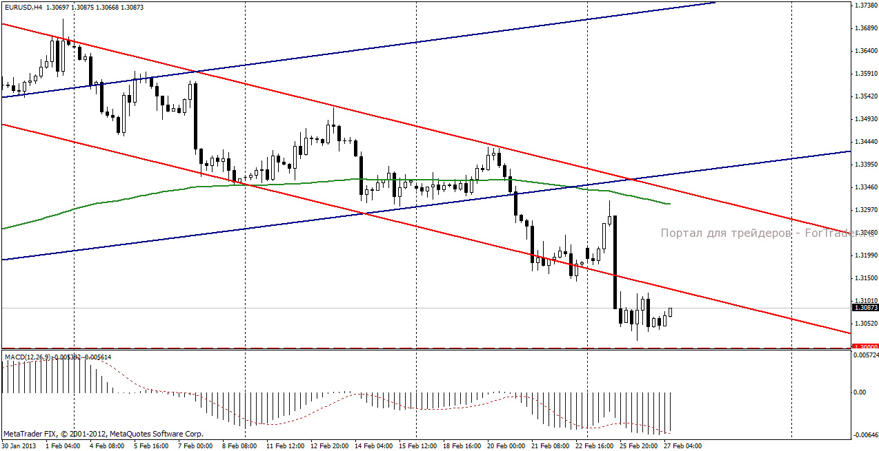 На торгах во вторник, 26 февраля пара евро/доллар продемонстрировала разнонаправленную динамику, в итоге окончив день невдалеке от уровня открытия. Рост пары, обусловленный осторожным спросом со стороны суверенных фондов и ближневосточных счетов, сдерживался опасениями инвесторов на фоне роста политической неопределенности в Италии. Выступление главы ФРС Бена Бернанке, в принципе, не сказавшего ничего нового, подкрепленное сильной статистикой, опубликованной в США, оказал поддержку доллару и сформировал негативную динамику пары евро/доллар.