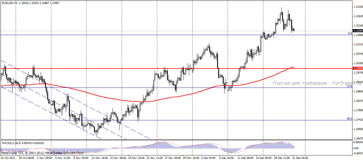Обещанное Бараком Обамой решение проблемы «фискального обрыва» до Рождества не состоялось. Перекладывания обвинений американскими политиками друг на друга и отсутствие компромисса завело переговоры в тупик, выход из которого, по мнению экспертов журнала ForTrader, вряд ли будет найден до Нового Года. Учитывая то, что первые три дня следующей недели на европейских и американских биржах будут выходными, на сегодняшних торгах возможна повышенная волатильность из-за сокращения позиций инвесторами перед праздничным периодом.