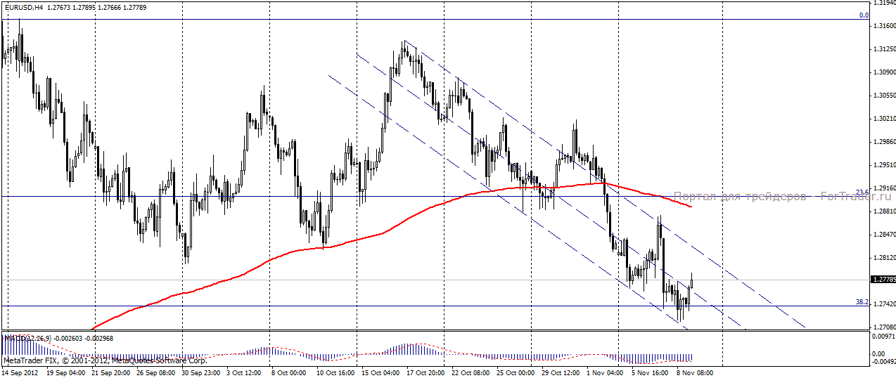 На прошедших торгах 8 ноября пара евро/доллар испытала на себе давление со стороны фундаментальных факторов. Резкую негативную реакцию рынок продемонстрировал после того, как в преддверии начала заседания ЕЦБ агентство новостей Market News International опубликовало информацию о том, что Европейский Центробанк в этом году не намерен скупать суверенные облигации, в связи со снижением их доходности. Решение не изменять процентную ставку в Еврозоне вновь отбросило пару к трехмесячным минимумам. Дополнительным фактором давления стала публикация данных по торговому балансу США и заявкам на пособие по безработице. Поддержку евровалюте, как считают эксперты журнала ForTrader, оказали опубликованные данные о прогнозе прибыли компании European Aeronautic,Defence & Space Co. – AEDS, занимающей лидирующее в Европе положение в оборонной и аэрокосмической отрасли. Согласно этим прогнозам, новый договор о рисках компании составлен с расчетом курса 1,2900 долларов за евро. Трудности компании, поставщика самолетов Airbus, заключаются в том, что расчет за самолеты проводится в долларах, а затраты на их производство оплачиваются в евро. При росте курса евро на 10 центов компании теряет в прибыли 1 млрд. долларов.