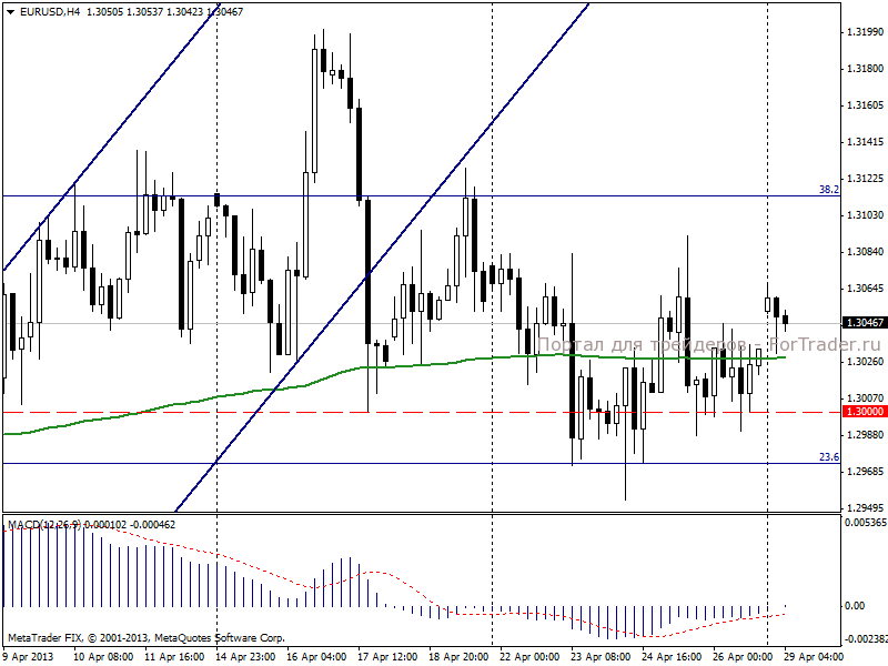 На торгах в пятницу, 25 апреля пара евро/доллар продемонстрировала положительную динамику. Основным драйвером для укрепления пары выступили предварительные данные по ВВП США за 1-й квартал 2013 года, не дотянувшие до прогноза аналитиков.