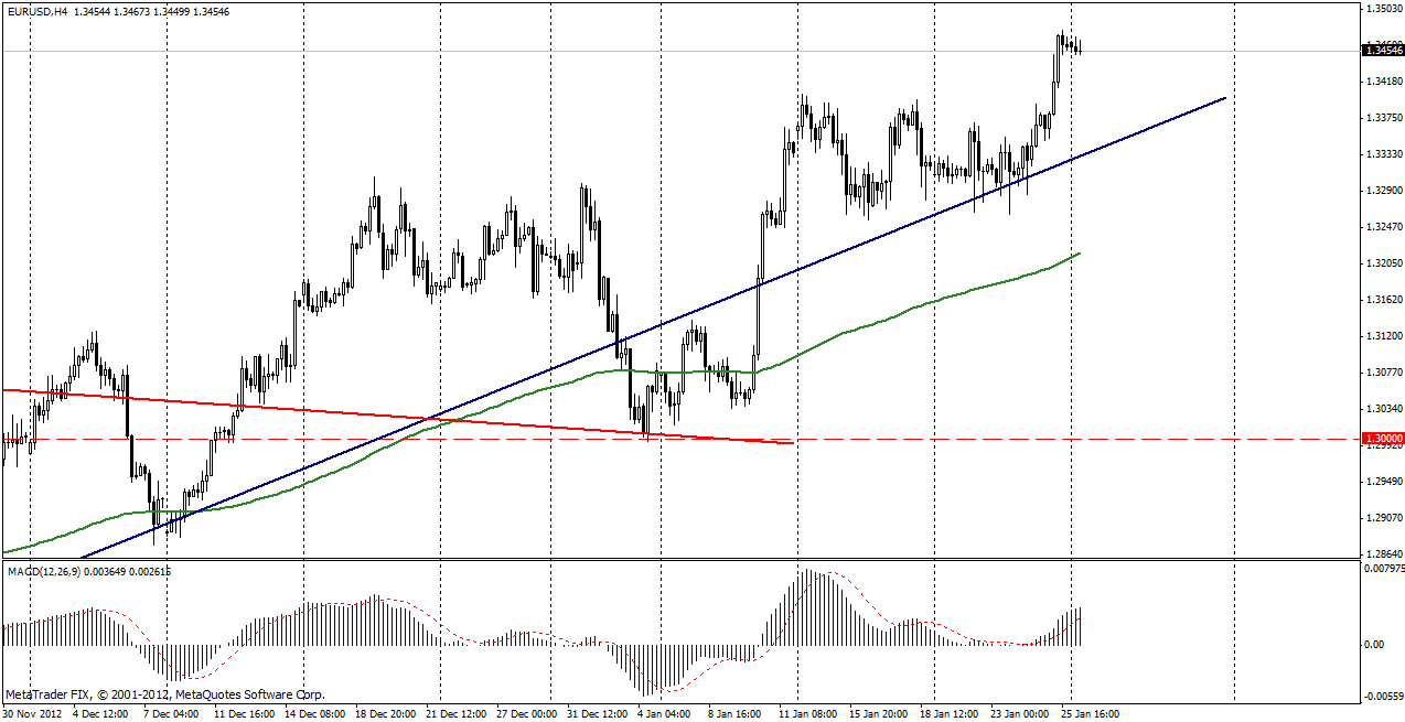 На торгах в пятницу, 25 января пара евро/доллар продемонстрировала положительную динамику. Новостной фон благоприятствовал росту евровалюты против американского доллара. Так, глава ЕЦБ Марио Драги заявил, что объем досрочного погашения кредитов европейскими финансовыми учреждениями в рамках программы LTRO составил 137,2 млрд евро, превзойдя ожидания, что позволило установить паре евро/доллар новый дневной максимум. Перехватил эстафету позитивных новостей для евро индекс экономических настроений IFO Германии, показавший положительную динамику. Свою роль в ослаблении доллара сыграли и данные по первичному рынку жилья, не оправдавшие прогнозы экономистов.