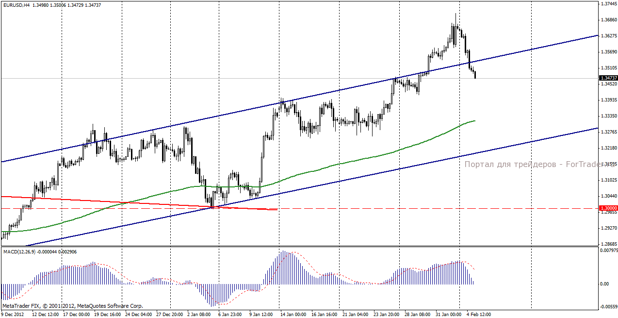 На торгах в понедельник, 4 февраля пара евро/доллар продемонстрировала негативную динамику. В целом, весь день нес для евровалюты сплошной негатив. В Испании оппозиционно настроенные силы требую отставки премьер-министра, обвиняя правительство в коррупции. Сильвио Берлускони, в рамках предвыборной программы, требует отмены налога не недвижимость, что вызывает опасения того, что Италия продолжит следовать выбранным курсом жесткой бюджетной экономии. Не порадовала евробыков и скудная экономическая статистика. Индекс уверенности инвесторов Sentix, хоть и показал увеличение, однако до прогноза не дотянул. Данные по рынку труда Испании показали увеличение количества безработных. Европейский негатив значительно снизил аппетит инвесторов к риску и на валютном рынке в паре евро/доллар весь день преобладали продажи, в результате чего пара опустилась на 150 пунктов.