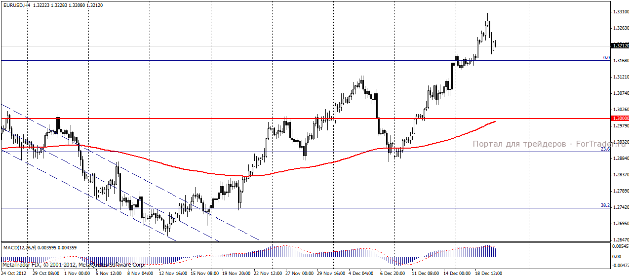 На торгах в среду, 19 декабря пара евро/доллар продемонстрировала разнонаправленную динамику. Оптимизм инвесторов по поводу скорого разрешения проблемы «фискального обрыва» в США, усиленный публикацией индекса деловых настроений Ifo Германии, поддержал восходящую динамику пары и позволил протестировать отметку 1,3308. Однако, на американской сессии, оптимизм несколько поугас. Неспособность быков преодолеть мощные офера выше 33-й фигуры, подкрепленная позитивной информацией с рынка первичного жилья США, вызвала фиксацию прибыли и вернула пару евро/доллар к уровням начала дня. Негатива евровалюте добавила широкомасштабная 24-х часовая забастовка бюджетных служащих в Греции, протестующих против снижения заработных плат и сокращения рабочих мест.