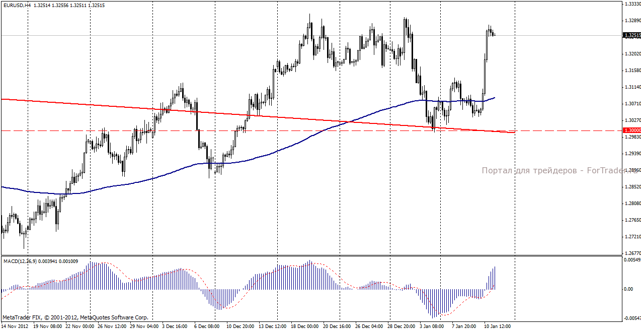 На торгах в четверг, 10 января пара евро/доллар продемонстрировала резко положительную динамику. Торгуясь с повышением на результатах аукционов итальянских и испанских облигаций, демонстрирующих уверенное снижение доходности, пара евро/доллар совершила стремительное ралли после пресс-конференции президента ЕЦБ Марио Драги. Глава Европейского Центробанка выразил уверенность в том, что экономика Еврозоны, несмотря на все трудности, будет восстанавливаться и финансовый кризис, нависший над Европой, будет успешно преодолен. Такой характер заявления вызвал волну покупок евровалюты и позволил паре евро/доллар закончить день на отметке 1,3266. Позитивом для евро оказалась и публикация еженедельных данных по рынку труда США, показавшая увеличение заявок на пособие по безработице.  Новость о снижении агентством Moody’s кредитного рейтинга Кипра сразу на три ступени с негативным прогнозом была ожидаемой и особой реакции на рынке не вызвала.