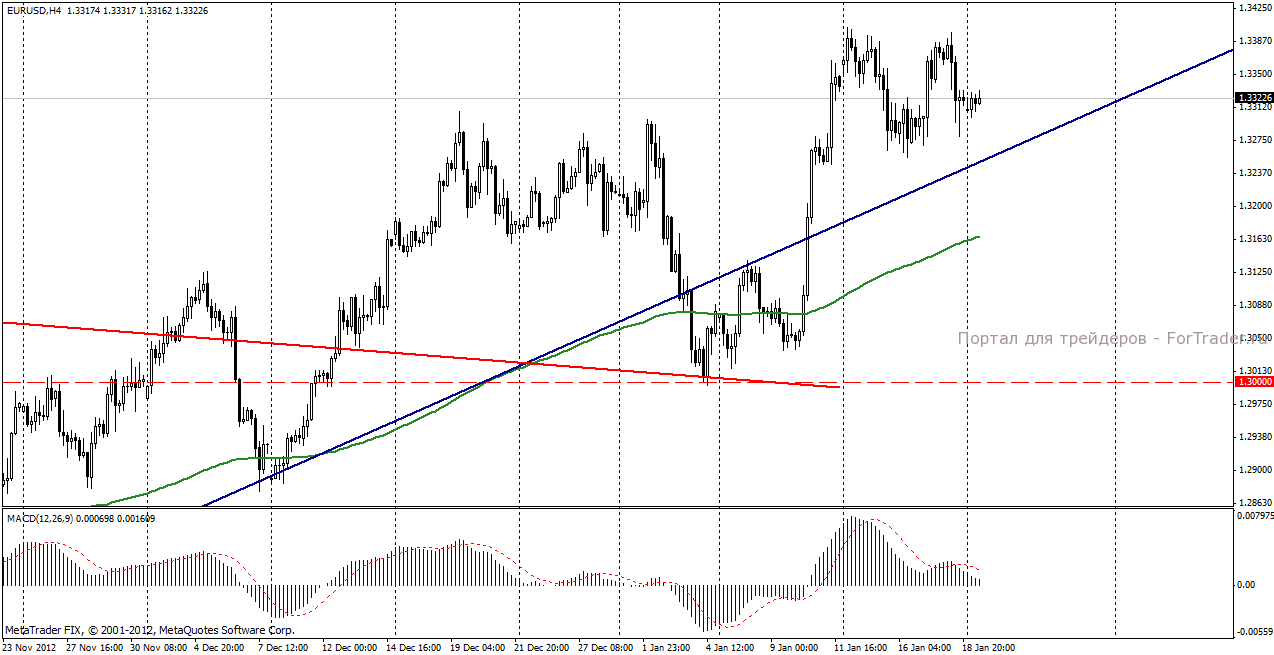 На торгах в пятницу, 18 января пара евро/доллар продемонстрировала отрицательную динамику. Поддержанный утренней публикацией экономических показателей Китая рост европейской валюты во второй половине дня сменился распродажами. Слухи о том, что ЕЦБ предпримет попытки снизить темпа роста краткосрочных процентных ставок снизили аппетиты инвесторов к риску. Коррекция в кросс-курсах евро, выступавших на прошедшей неделе основными драйверами роста, также оказала давление на курс евро против доллара. Усилила доллар поступившая из США информация о достижении компромисса между политическими силами о временном повышении планки государственного долга, что даст время до 15 апреля для окончательного устранения угрозы технического дефолта США.