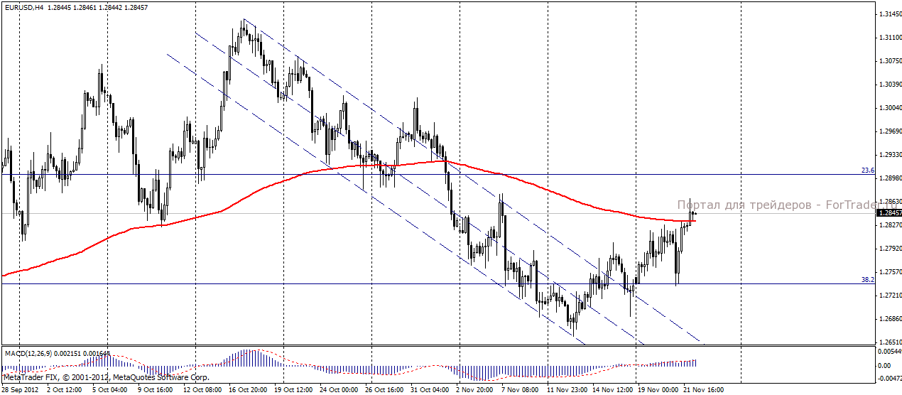 На торгах в среду, 21 ноября пара евро/доллар, в некоторой степени, повторила сценарий предыдущего дня. Новость о переносе сроков решения вопроса предоставления Греции финансовой помощи вызвала на азиатской сессии распродажи евровалюты, что дало паре возможность протестировать уровень 1,2735. Однако, надежды инвесторов в благополучный исход не угасли, и, в течении дня, евро смог отыграть свои потери против доллара, завершив день на отметке 1,2813. Не последнюю роль в ослаблении доллара сыграли экономические показатели: количество обращений за пособием по безработице в США сократилось, индекс Мичиганского университета оказался ниже предыдущего, а Банк Англии сохранил программу покупки облигаций без изменений.