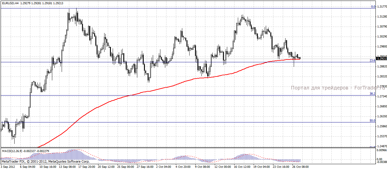 На прошедших торгах 26 октября пара евро/доллар продолжала снижаться и достигла уровня 1,2880, как и предполагали эксперты журнала ForTrader. Продолжающаяся неопределенность в Еврозоне продолжает оказывать негативное влияние на инвесторов и заставляет их пересматривать свое отношение к вложениям в рисковые активы. Во второй половине дня публикация данных по ВВП США позитивно отразилась на аппетите к риску, а появление сообщений о достижении соглашения между Испанией и ЕЦБ о готовности к первому декабря создать компанию по управлению проблемными активами, позволили паре достигнуть отметки $1.2935.