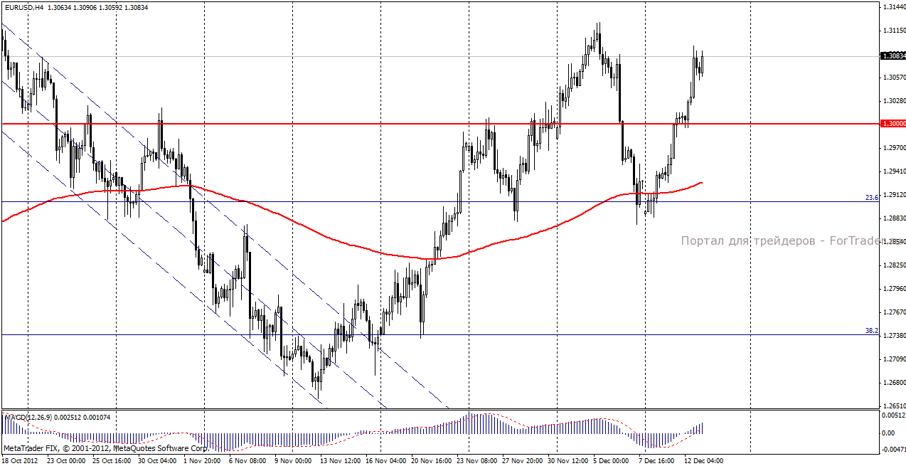 На торгах в четверг, 13 декабря, евро/доллар торгуется около уровня закрытия вчерашнего дня. Сегодня участники рынка будут находиться под влиянием решения FOMC о выкупе облигаций на сумму 45 млрд. долларов ежемесячно, а также выкупе ипотечных бумаг в рамках программы QE3 в размере 40 млрд. долларов в месяц. Особенностью вчерашнего пресс-релиза FOMC, который вызвал удивление рынка, является привязка перспектив кредитно-денежной политики к инфляционным показателям и данным по безработице. Также новостью дня будет заседание Еврогруппы, от которого участники рынка ждут официальной разморозки денежного транша для Греции, в размере 43,7 млрд евро.