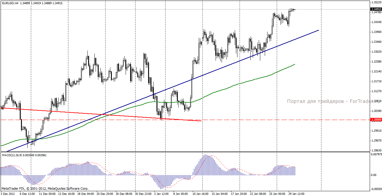На торгах во вторник, 29 января пара евро/доллар продемонстрировала позитивную динамику. Инвесторы, в преддверии заседания FOMC, соблюдали осторожность, не торопясь с покупками. Публикация индекса потребительского климата Германии (Gfk), немного превысившего прогноз, не смогла увеличить интерес к покупкам евровалюты. Однако после публикации смешанной статистики из США: индекса доверия потребителей СВ и композитного индекса цен на жилье позиции доллара ослабли, что позволило паре евро/доллар установить новый внутридневной максимум и вплотную приблизиться к 35-й фигуре.