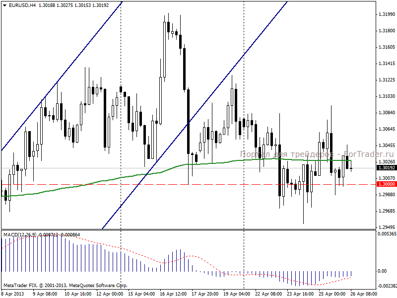 На торгах в четверг, 25 апреля пара евро/доллар продемонстрировала разнонаправленную динамику, закончив день немного около уровня открытия. Умеренное укрепление европейской валюты в течение первой половины дня сменилось резкими распродажами после выхода данных по количеству заявок на пособие по безработице в США, показавших уменьшение больше прогнозов. Еще одним фактором, ослабившим евро, стал прогноз от Goldman Sachs, согласно которому на заседании 2 мая ЕЦБ снизит процентную ставку до 0,5%.