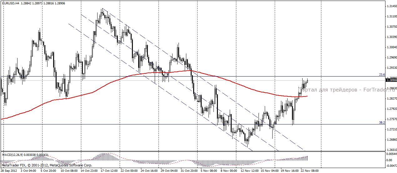 На торгах в четверг, 22 ноября пара евро/доллар, показала положительную динамику. Опубликованные данные по индексу PMI Франции, Германии и Еврозоны оказались в рамках прогнозов. Позитивным фактором для евро, как и прогнозировали аналитики журнала ForTrader, оказался аукцион по размещению 3-х и 5-ти летних долговых обязательств Испании, показавших снижение доходности до 3.617% и 4.477% соответственно. Вчерашние торги отличались низкой ликвидностью в связи с выходным днем на американских биржах из-за празднования Дня Благодарения.