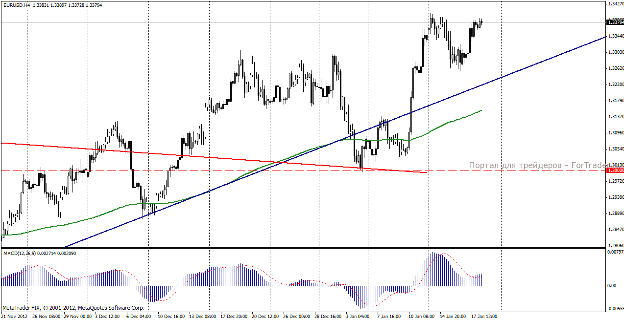 На торгах в четверг, 17 января пара евро/доллар продемонстрировала уверенную позитивную динамику. Драйвером для роста европейской валюты выступило заявление министра экономики Японии, о том, что СМИ неверно истолковали его предыдущие комментарии по поводу опасности, которое несет для японской экономики резкое ослабление курса иены. Рост кросс-курса евро/иена обусловил позитивную динамику и в паре евро/доллар. Аукцион по продаже испанских бондов, на сумму 4,5 млрд. евро стал еще одним фактором укрепления европейской валюты. Опубликованные на американской сессии данные по рынку жилья и количеству заявок на пособие по безработице ослабили доллар, поддержав евро. Появившиеся на рынках слухи о достижении предварительной договоренности между политическими силами США по проблеме технического дефолта также увеличили аппетиты инвесторов к рисковым активам.