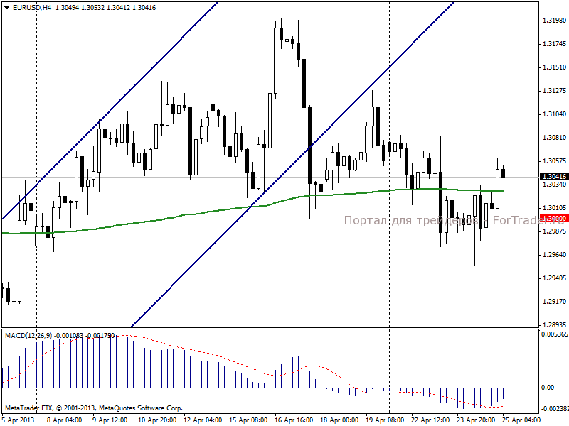 Сегодня, 25 апреля, евро/доллар торгуется выше уровня закрытия предыдущего торгового дня. Повлиять на динамику европейской валюты сегодня могут публикация предварительных данных по ВВП Великобритании за 1-й квартал 2013 года и количество обращений за пособием по безработице в США.