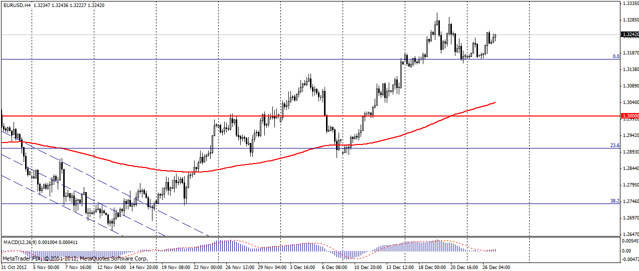 На торгах в среду, 26 декабря пара евро/доллар продемонстрировала положительную динамику. Основным драйвером рынка все так же выступает ситуация с «фискальным обрывом» в США. Президент Обама вчера прервал свой отпуск и вернулся в Вашингтон, что было позитивно воспринято участниками рынками и усилило спрос на рисковые активы. Однако обращение министра финансов Тимоти Гейтнера к Конгрессу о том, что потолок госдолга может быть достигнут уже 31 декабря текущего года и призывом поторопиться с решением проблемы «фискального обрыва» несколько поубавило оптимизма у участников рынка и позволило доллару частично восстановить свои потери.