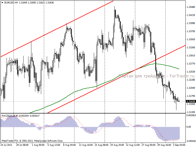 По мнению аналитиков журнала ForTrader, близость серьезных фундаментальных событий вносит коррективы в ценовую динамику основной валютной пары. В преддверии завтрашнего выступления главы ЕЦБ Марио Драги участники рынка не торопятся покупать евро. Также давление на пару создает стабильный спрос на американскую валюту, как представителя защитных активов, в связи с планируемой военной операцией против Сирии. К тому же, ожидания участников рынка относительно объявления о начале сокращения программы QE уже на сентябрьском заседании FOMC располагают к покупкам доллара.