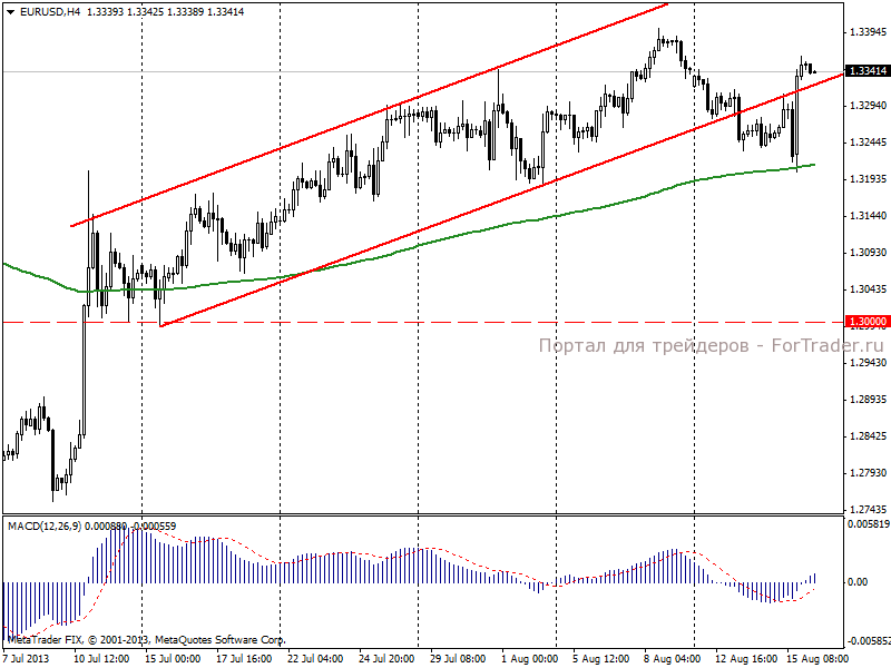 На торгах в четверг, 15 августа, пара евро/доллар продемонстрировала восходящую динамику. Сначала техническая картина укладывалась в классический сценарий «пробой уровня поддержки восходящего тренда с откатом к ней и последующим снижением» при поддержке сильных данных по количеству обращений за пособием по безработице. Тем не менее, радость медведей была не долгой. После выхода слабых данных по промышленному производству в США и производственного индекса ФРБ Филадельфии, не оправдавших прогнозы, европейская валюта смогла восстановить потерянные позиции и вернуться в границы восходящего тренда.
