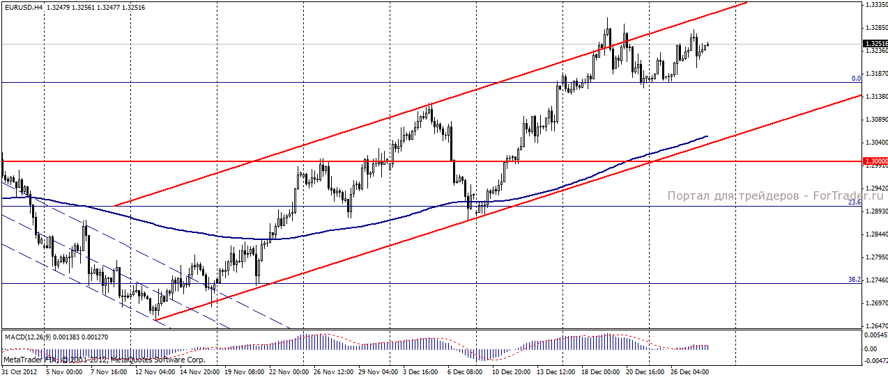 По мнению экспертов журнала ForTrader, пара евро/доллар продолжит стремиться к уровню сопротивления 1,33. Взятие этого барьера будет зависеть исключительно от новостей по «бюджетному обрыву» в США. Любой позитив будет расцениваться участниками рынка как положительный фактор для евровалюты.
