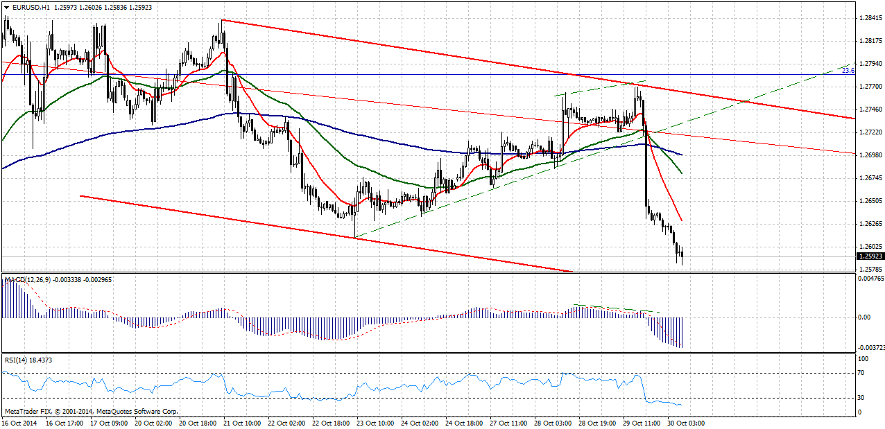 На часовом графике обозначенный нами ранее восходящий минитренд (зеленая пунктирная линия) был сломлен. В результате можно нарисовать нисходящий тренд, в рамках которого цена будет стремиться к линии поддержки на уровне 1,2550.