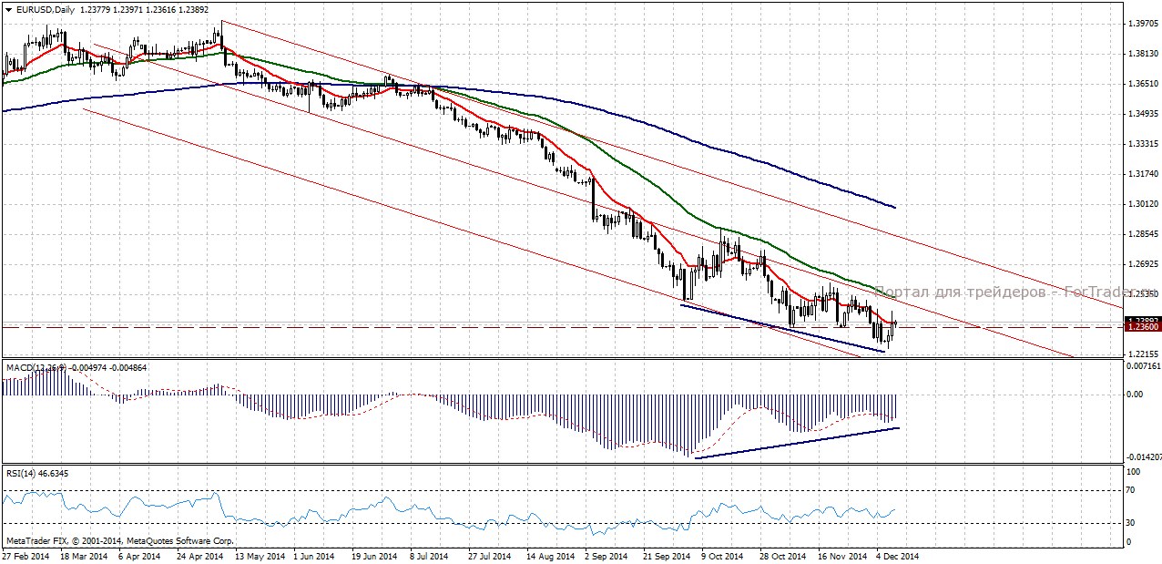 На дневном графике среднесрочный нисходящий тренд не теряет актуальности. Цена, не дойдя до линии поддержки, пытается формировать восходящий коррекционный импульс. Обозначенный экспертами журнала ForTraders.org ранее уровень поддержки 1,2360 оказался пробит вниз, однако впоследствии цена вернулась к нему и смогла закрепиться выше, что говорит об отсутствии на данный момент потенциала для продолжении снижения.