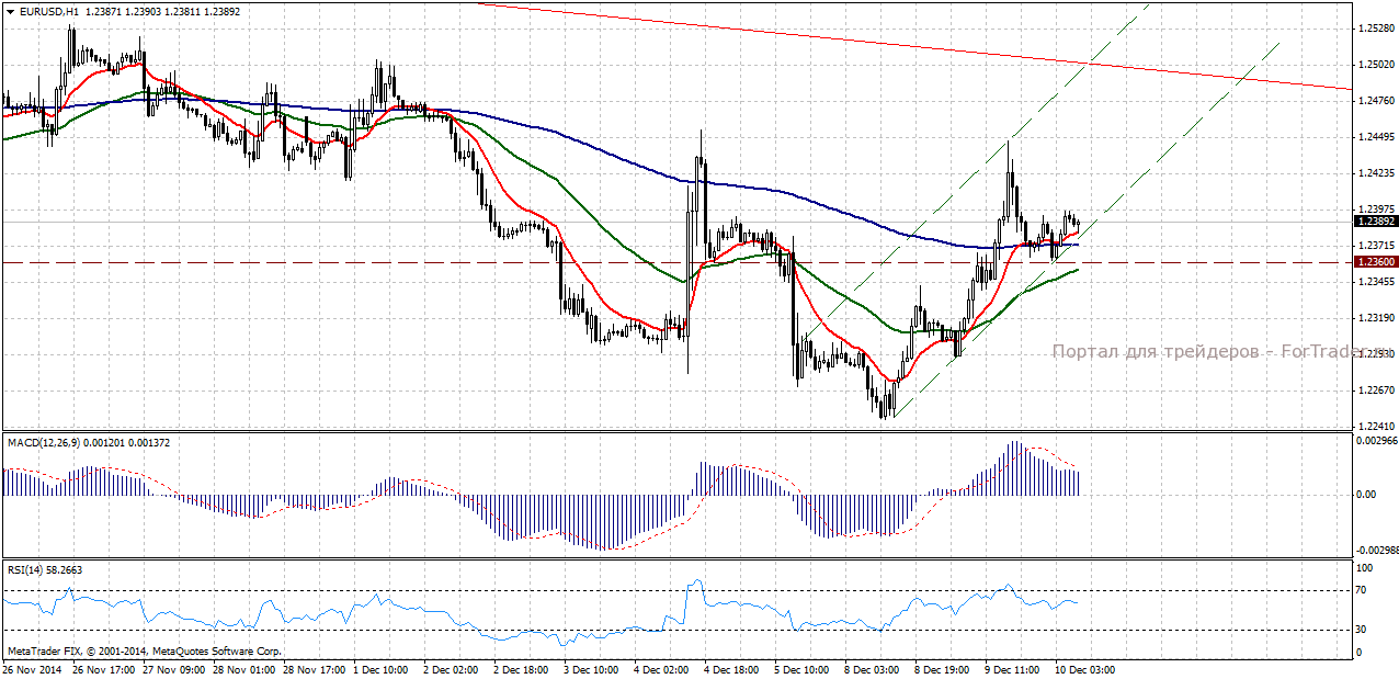 На часовом графике можно увидеть краткосрочный восходящий тренд. В настоящий момент цена находится у линии сопротивления, от которого может начаться очередной восходящий импульс с вероятной целью 1,2500 (линия сопротивления краткосрочного восходящего тренда, срединная линия среднесрочного нисходящего тренда).