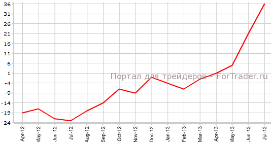 Согласно вышедшим 13 августа данным RICS, баланс цен на жилье Великобритании в июле составил 36% против 21% в предыдущем месяце. Рынок предполагал, что показатель будет равен 25%.