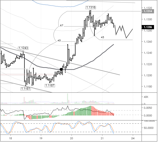 Тема со ставками ФРС США отошла на второй план, так как обострилась ситуация на Ближнем Востоке. Бегство от рисков может перейти к глубокой коррекции по евро. На данном этапе по прогнозу ожидаем нисходящую коррекцию до 45 градуса 1,1263. Если падение будет быстрее прогноза, то до 1,1255/50.