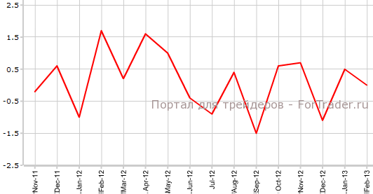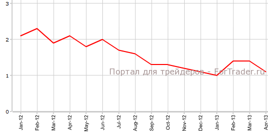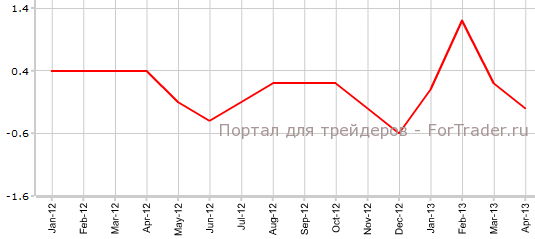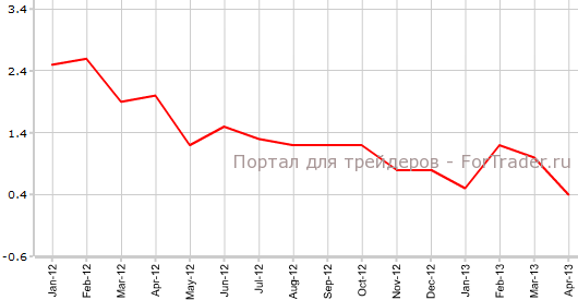 Согласно представленным 17 мая официальным данным, индекс потребительских цен Канады в апреле сократился на 0,2% по сравнению с предыдущим месяцем и поднялся на 0,4% против аналогичного периода 2012 года. Экономисты прогнозировали, что CPI останется без изменений в месячном исчислении и возрастет на 0,6% в годовом. Вместо этого потребительские цены Канады падаются второй месяц подряд, отмечает журнал ForTrader.
