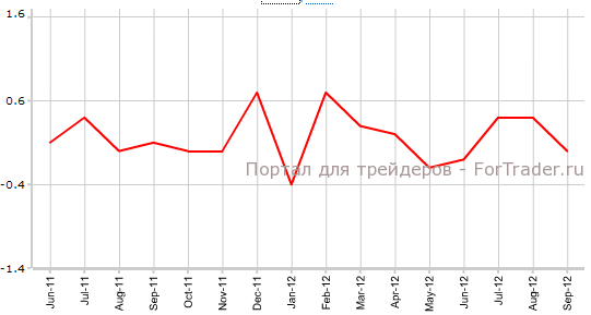 Согласно данным федерального статистического бюро Германии, предварительный индекс потребительских цен страны в сентябре остался без изменений, как в месячном выражении (0,0%), так и в годовом (+2,0%). Аналитики прогнозировали данный показатель в диапазоне -0,1% м/м, +2,0% г/г. Индекс потребительских цен повторил свой уровень ноября 2011 года, выйдя вниз из бокового канала.