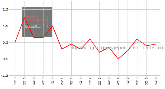 Журнал ForTrader сообщает, что согласно отчету Statistische Bundesamt Deutschland предварительные данные по изменению объема ВВП Германии составили 0.4% кв/кв и 1.3% г/г, почти совпав с ожиданиями рынка, который прогнозировал рост 0.3% кв/кв и 1.3% г/г. В 3 квартале 2013 года рост был ниже и составлял 0.3% кв/кв и 1.1% г/г.
