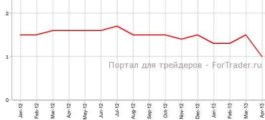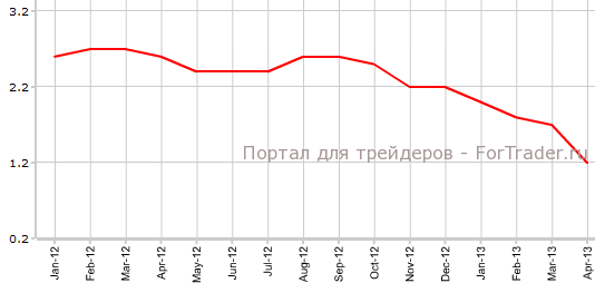 Согласно данным Eurostat, опубликованным 16 мая, индекс потребительских цен еврозоны в апреле снизился на 0,1% по сравнению с мартом и поднялся на 1,2% против аналогичного периода 2012 года. Тем самым CPI подтвердил прогнозы экономистов. В марте наблюдался повсеместный рост потребительских цен — на 1,2% как в месячном, так и в годовом выражении.