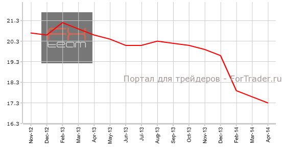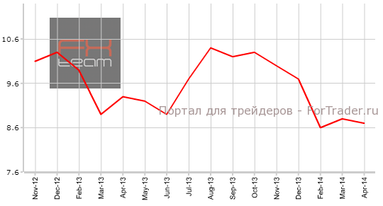 Изменение объема промышленного производства также вышло хуже прогноза и составило 8.7% г/г, при прогнозе 8.9% г/г. В марте 2014 изменение находилось на отметке 8.8% г/г.