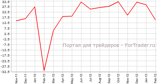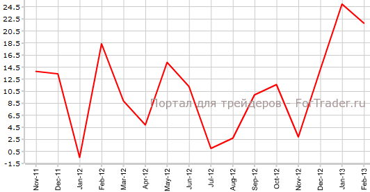 Импорт Китая в феврале снизился на 15,2% против аналогичного периода 2012 года, против ожидаемого аналитиками значения -10,0%. Тем самым показатель зарегистрировал минимум за 14 месяцев, сообщает журнал ForTrader. Экспорт из Китая в феврале увеличился на 21,8% г/г, когда средневзвешенный прогноз экономистов предусматривал рост на 5,0%.