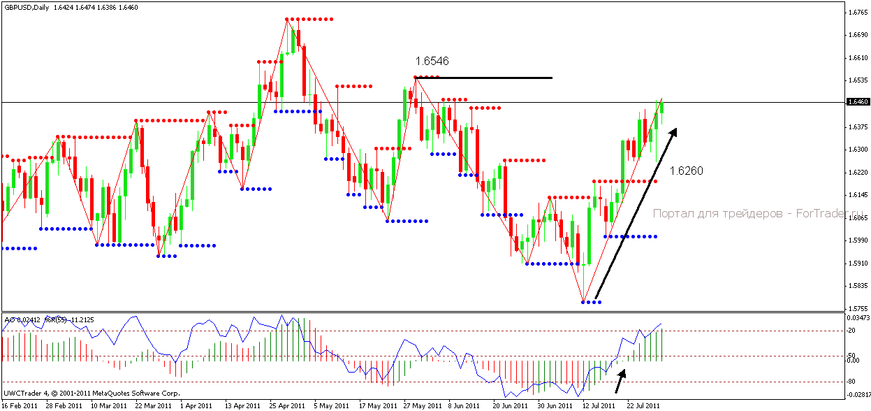 В краткосрочной перспективе пара GBP/USD стремится к максимумам, сначала к сопротивлению 1.6546. Трехволновая коррекция от 1.6746 возможно уже завершилась до уровня 1.5780. Пробой сопротивления обеспечит уверенное бычье движение, и пара GBP/USD может достичь уровня 1.6746. В случае движения вниз необходим пробой поддержки 1.6260 для уверенного падения пары в краткосрочной перспективе. Но нынешнее движение показывает, что при движении вниз, пара может сформировать всего лишь дополнительную коррекцию.