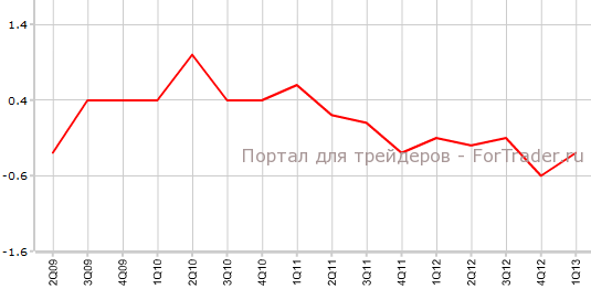 Как свидетельствуют опубликованные 4 июля данные статистического агентства ЕС Eurostat, окончательный ВВП еврозоны в 1-м квартале упал на 0,3% по сравнению с предыдущим кварталом и на 1,7% против аналогичного периода 2012 года. Экономисты прогнозировали снижение показателя на 0,2% в квартальном выражении и на 1,1% в годовом.