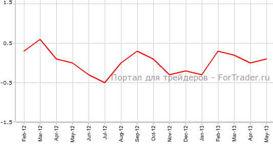 Согласно представленным 6 июня официальным данным, индекс потребительских цен Швейцарии в мае поднялся на 0,1% по сравнению с апрелем и снизился на 0,5% против того же периода 2012 года. Экономисты прогнозировали, что CPI вырастет на 0,1% в месячном выражении и сократится на 0,6% в годовом. В апреле показатель составлял 0,0% м/м и -0,6% г/г, сообщает журнал FоrTrrader.