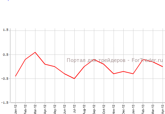 Согласно опубликованным 8 мая данным, индекс потребительских цен в Швейцарии в апреле остался без изменений по сравнению с предыдущим месяцем и упал на 0,6% против аналогичного периода 2012 года. Аналитики ожидали, что CPI страны прибавит 0,1% в месячном выражении и снизится на 0,5% в годовом.