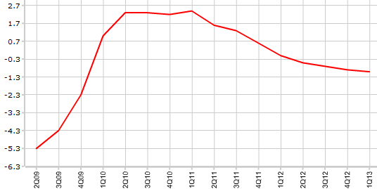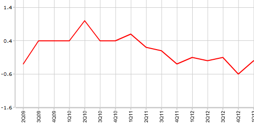 Согласно опубликованным 15 мая данным статистического агентства ЕС Eurostat, предварительный ВВП еврозоны в 1-м квартале опустился на 0,2% по сравнению с предыдущим кварталом и на 1,0% против аналогичного периода прошлого года. Экономисты ожидали, что показатель снизится на 0,1% в квартальном выражении и на 0,9% в годовом.