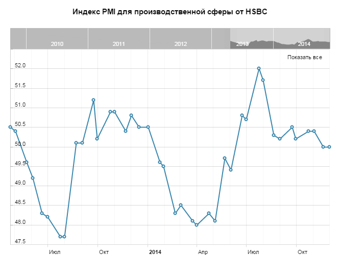 Окончательное значение индекса PMI для производственной сферы от HSBC, рассчитываемый агентством MarkitEconomics, осталось на прежней с первоначальным значением отметке в 50.0% в ноябре, подтвердив прогноз рынка. В октябре индекс находился на уровне в 50.4%. Тем самым, показатель упал до шестимесячного минимума.