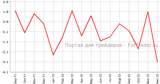 Согласно вышедшим 15 февраля официальным данным, поставки в производственной сфере Канады в декабре уменьшились на 3,1% по сравнению с ноябрем и на 3,9% против аналогичного периода 2011 года. Экономисты прогнозировали, что показатель снизится на 0,4% в месячном выражении. В ноябре промышленные нагрузки составляли 1,9% м/м и -0,2% г/г.