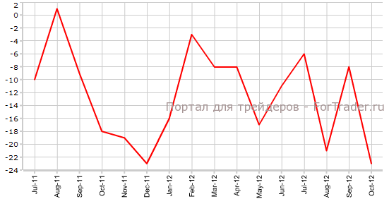 Согласно представленным 24 октября данным Британской конфедерации промышленников, индекс заказов в промышленности в октябре составил -23 против -8 в сентябре, тем самым достигнув дна в этом году. Прогноз рынка по данному показателю составлял -6. Рынки по прежнему ожидают позитива от экономики Еврозоны, что по мнению журнала ForTrader, является спорным. Общая обстановка далеко не благоприятна, это видно невооруженным глазом, поэтому за выходом негативной статистики естественно последует спад евро, а в данном случае еще и фунта.