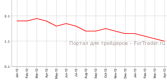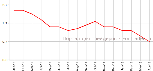 Согласно представленным 31 мая официальным данным, индекс цен расходов на личное потребление в США в апреле снизился на 0,3% по сравнению с мартом и поднялся на 0,7% против аналогичного периода 2012 года. Аналитики ожидали, что показатель вырастет на 0,1% в месячном выражении и на 1,0% в годовом. В марте личные расходы -0,1% м/м и 1,0% г/г, сообщает журнал ForTrader.