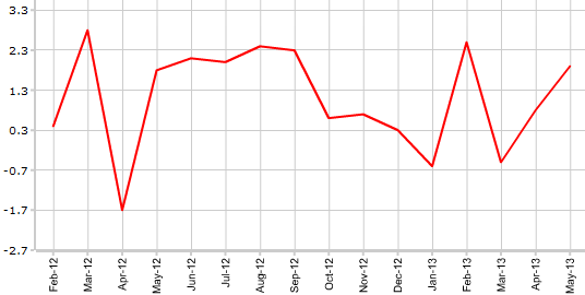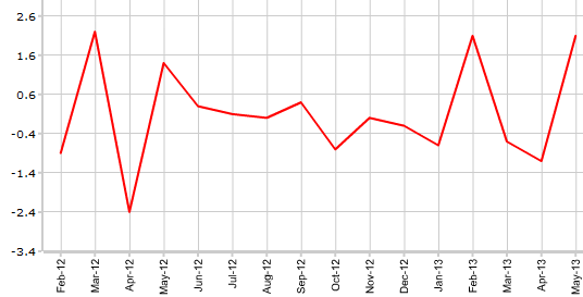 Согласно вышедшим 20 июня данным ONS, розничные продажи Великобритании в мае выросли на 2,1% по сравнению с апрелем и на 1,9% против аналогичного периода 2012 года. Экономисты прогнозировали, что показатель прибавит 0,8% в месячном выражении и 0,2% в годовом. В апреле розничные продажи Великобритании, которые повторили уровень февраля, составляли -1,1% м/м и 0,8% г/г.