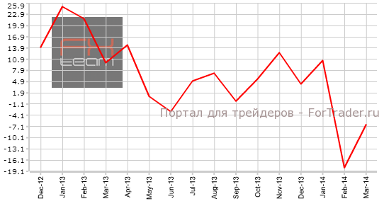 Изменение объема экспорта все еще показывает негативную динамику и составляет -6.6% г/г. Прогноз рынка находился на отметке 4.0% г/г. Предыдущее значение составляло -18.1% г/г.