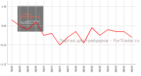 Изменение объема ВВП в 4 квартале составило 0.2% кв/кв (1.7% г/г). Эксперты ожидали значений на уровне 0.4% кв/кв (2.0 % г/г). В 3 квартале значения составили 0.5% (2.1 %г/г). Замедление роста ВВП отрицательно повлияет на курс национальной валюты, полагают аналитики журнала ForTrader.