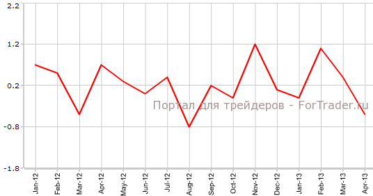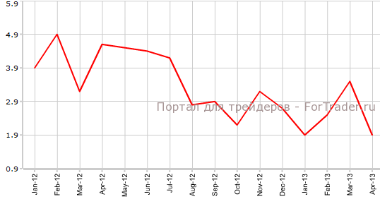 Как свидетельствует официальная статистика, обнародованная 15 мая, промышленное производство США в апреле снизилось на 0,5% против мартовского уровня (худший результат с августа) и возросло на 1,9% по сравнению с аналогичным периодом 2012 года. Экономисты прогнозировали, что показатель сократится лишь на 0,1% в месячном выражении. В феврале были зарегистрированы значения 0,4% м/м и 3,5% г/г, сообщает журнал ForTrader.
