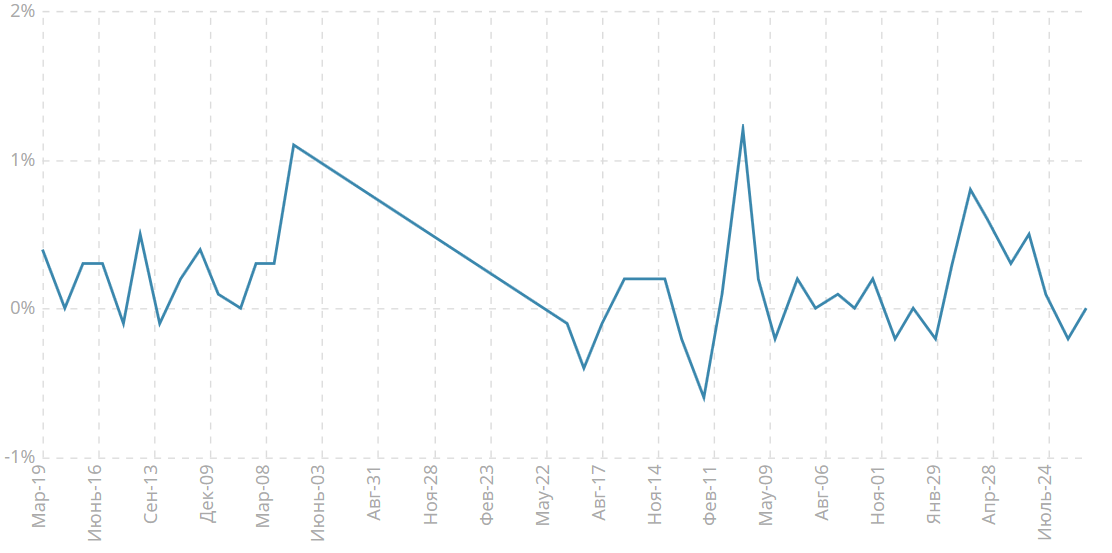 Индекс потребительских цен составил 0.0% м/м (2.1% г/г). Аналитики ожидали значения в размере -0.1% м/м (2.1% г/г). В июле было зафиксировано снижение на -0.2% м/м (2.1% г/г). По сравнению с июлем цены на бензин снизились на 3.2%, что и оказало самое существенное влияние на замедление роста цен.
