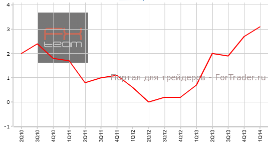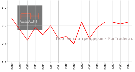 Предварительные данные по изменению объема ВВП составили 0.8% кв/кв (3.1% г/г). Прогноз рынка был рассчитан на уровень в 0.9% кв/кв (3.2% г/г). В 4 квартале 2013 года были зафиксированы значения на отметке 0.7% кв/кв (2.7% г/г).